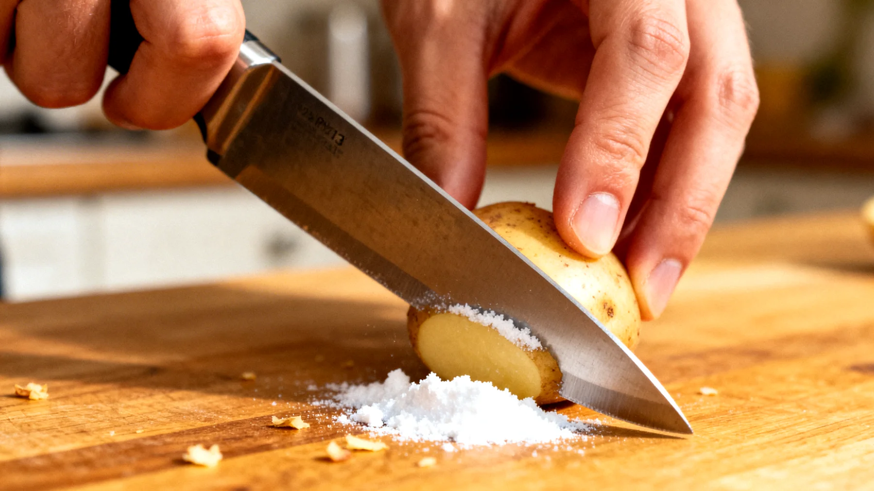 Das Verständnis für diesen Prozess beruht auf Materialkunde und Mikromechanik: Auf molekularer Ebene verändert sich die Schneidkante von Edelstahl unter wiederholtem Kontakt mit stärkehaltigen Oberflächen. Stärke, Feuchtigkeit und Säuren wirken wie ein mikroabrasives Gemisch, das die feinen Grate der Klinge verschiebt und ablagert. Um ihre Schärfe zurückzugewinnen, reichen zwei Materialien, die ohnehin jeder besitzt – Alufolie und Essig.