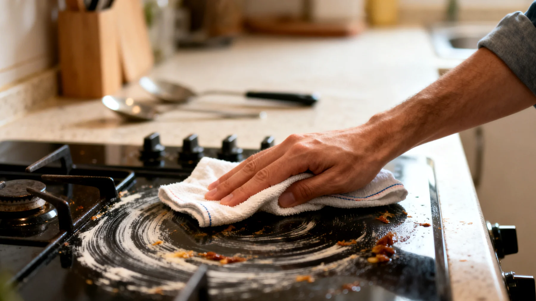 Die Vorerwärmung spielt eine entscheidende Rolle: Das Kochfeld sollte lauwarm, aber nicht heiß sein, etwa handwarm. In diesem Temperaturbereich lösen sich fetthaltige Rückstände leichter, ohne die Oberfläche thermisch zu belasten. Diese Phase ist wichtig, um die chemischen Bindungen der Ablagerungen aufzuweichen, bevor mechanische Kraft angewendet wird.